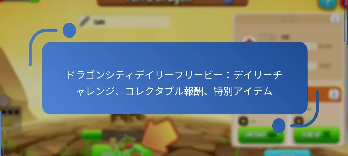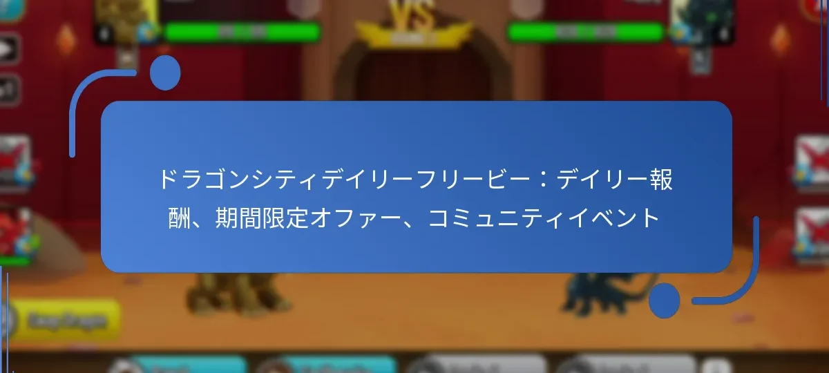 ドラゴンシティでは、プレイヤーはログイン報酬、期間限定オファー、魅力的なコミュニティイベントなど、さまざまな日々の無料特典を楽しむことができます。日々の報酬は貴重なゲーム内アイテムや独占的なドラゴンを提供し、期間限定オファーではゲームプレイを向上させるユニークなボーナスが用意されています。コミュニティイベントはさらに体験を豊かにし、協力を促進し、参加に対するエキサイティングなインセンティブを提供します。 ドラゴンシティの日々の報酬とは? ドラゴンシティの日々の報酬は、プレイヤーが毎日ログインすることで得られるインセンティブです。これらの報酬には、さまざまなゲーム内アイテム、リソース、さらにはゲームプレイや進行を向上させる独占的なドラゴンが含まれることがあります。 利用可能な日々の報酬の種類 プレイヤーは、ゲーム体験を向上させるさまざまな日々の報酬を期待できます。一般的な種類には以下が含まれます: ゴールド: 建物の建設やアップグレードに必要な重要なリソース。 食料: ドラゴンを育てたりレベルアップさせたりするために必要。 宝石: 特別な購入に使用されるプレミアム通貨。 ドラゴン: 日々の報酬を通じてのみ入手可能な独占的なドラゴン。 ブースト: 生産を加速させたりリソース生成を増加させたりする一時的な強化。 日々の報酬を受け取る方法 ドラゴンシティで日々の報酬を受け取るのは簡単です。プレイヤーは毎日ゲームにログインし、通常はメイン画面またはイベントタブ内にある報酬セクションに移動する必要があります。 そこに到達したら、報酬アイコンをクリックして日々の賞品を受け取ることができます。報酬を正常に受け取るためには、インターネットに接続されていることを確認することが重要です。 日々の報酬を受け取るための要件 日々の報酬を受け取るためには、プレイヤーは毎日少なくとも一度はログインする必要があります。継続性が重要であり、1日でも欠かすとストリークがリセットされる可能性があります。 さらに、一部の報酬はプレイヤーが特定のレベルに達したり、特定のタスクを完了したりすることを要求する場合があります。各報酬の要件を常に確認し、利益を最大化することをお勧めします。 日々の報酬の頻度とリセット時間 日々の報酬は24時間ごとにリセットされ、通常はプレイヤーのローカルタイムゾーンに基づいて毎日同じ時間に行われます。これにより、プレイヤーはログインの計画を立て、報酬を逃さないようにすることができます。 場合によっては、特別なイベントが追加の報酬を提供したり、リセット時間を変更したりすることがあるため、ゲーム開発者からの発表に常に注意を払うことが有益です。 日々の報酬がゲームプレイに与える影響 日々の報酬は、プレイヤーがより早く進行するのを助けるために必要なリソースを提供することで、ゲームプレイに大きな影響を与えます。ゴールドや食料を定期的に収集することで、ゲーム内でのアップグレードや拡張を迅速に行うことができます。 さらに、日々の報酬を通じて得られる独占的なドラゴンは、プレイヤーのコレクションや戦略を向上させ、戦闘をより簡単で楽しいものにします。 コミュニティのフィードバックは、これらの報酬の重要性を強調することが多く、日々のエンゲージメントを促進し、プレイヤー間の達成感を育みます。報酬を最大化するために、プレイヤーは一貫してログインし、追加のボーナスを提供する可能性のある期間限定オファーやコミュニティイベントに参加することをお勧めします。 ドラゴンシティの現在の期間限定オファーとは? ドラゴンシティの現在の期間限定オファーは、プレイヤーにゲームプレイを向上させるユニークな報酬やボーナスを提供します。これらのオファーには、特別なドラゴン、リソース、または通常のゲームプレイでは入手できない独占的なアイテムが含まれることが一般的です。 現在の期間限定オファーの説明 ドラゴンシティの期間限定オファーには、プレイヤーが取得できる独占的なドラゴン、特別な繁殖イベント、またはユニークな生息地が含まれることがよくあります。これらのオファーは、エンゲージメントを促進し、プレイヤーにコレクションを拡大する機会を提供するように設計されています。 たとえば、プレイヤーは特定のタスクや購入を通じてのみ入手可能な特別なドラゴンが期間限定で利用可能であることを見つけるかもしれません。これらのオファーは、ゲーム内通貨の割引やゲームプレイ体験を向上させる特別なバンドルを含むなど、さまざまな性質を持つことがあります。 期間限定オファーの期間と期限 期間限定オファーは通常、数日から数週間の間持続します。各オファーには明確に記載された期限があり、プレイヤーは報酬を利用するために迅速に行動する必要があります。 プレイヤーは、ゲームの通知や公式のドラゴンシテ