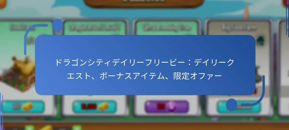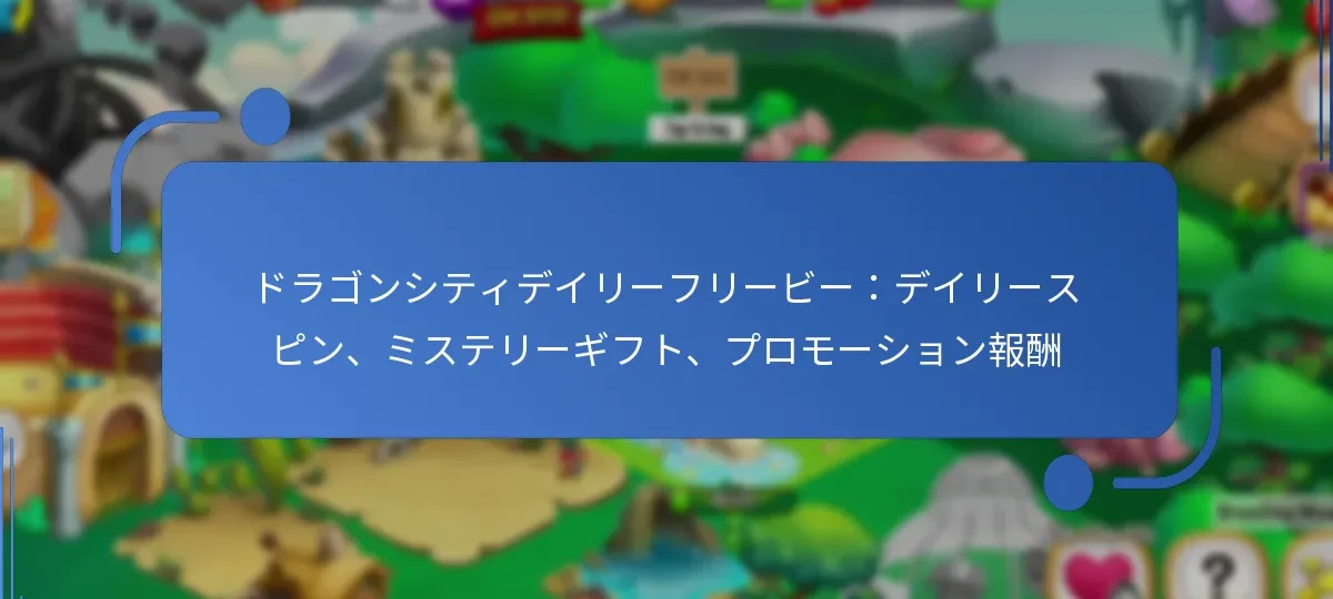 ドラゴンシティでは、プレイヤーはデイリースピン、ミステリーギフト、プロモーション報酬などのデイリーフリーを活用して、ゲーム体験を向上させることができます。これらの報酬は貴重なアイテムやリソースを提供し、プレイヤーがリアルマネーを使わずに進行できるようにします。これらの機能に定期的に関与し、その利用可能性を理解することで、プレイヤーは利益を最大化し、より豊かなゲームプレイ体験を楽しむことができます。 ドラゴンシティのデイリーフリーとは何ですか? ドラゴンシティのデイリーフリーには、プレイヤーがゲーム体験を向上させるために獲得できるデイリースピン、ミステリーギフト、プロモーション報酬が含まれます。これらの報酬は貴重なアイテムやリソースを提供し、プレイヤーがリアルマネーを使わずにゲームを進めるのに役立ちます。 デイリースピンの概要 デイリースピンは、プレイヤーがさまざまな報酬を獲得するチャンスを得るためにホイールを回す機能です。毎日、プレイヤーはこのスピンにアクセスでき、食べ物やゴールド、さらにはレアドラゴンなどのアイテムを得ることができます。 スピンのメカニクスはシンプルです:プレイヤーはスピンボタンをタップし、ホイールが回るのを見守ります。結果はランダムですが、潜在的な報酬はゲームプレイに大いに役立ちます。 デイリースピンは無料ですが、プレイヤーはより良い報酬を得るために追加のスピンを購入することもできることを覚えておくことが重要です。 ミステリーギフトの詳細 ミステリーギフトは、プレイヤーがゲームのさまざまなタイミングで受け取ることができるサプライズ報酬です。これらのギフトには、食べ物やゴールド、特別なドラゴン、独占的な装飾など、さまざまなアイテムが含まれることがあります。 ミステリーギフトの種類は、季節限定アイテムや期間限定オファーなど、さまざまです。 プレイヤーは特別なイベント中やログインボーナスとしてこれらのギフトを受け取ることがよくあります。 ミステリーギフトを受け取ることは興奮を加えます。プレイヤーは開けるまで何を得るかわからないからです。この予測不可能性はエンゲージメントを高め、プレイヤーが定期的にログインすることを促します。 プロモーション報酬の説明 プロモーション報酬は、ドラゴンシティの特定のイベントやキャンペーン中に提供される特別なボーナスです。これらの報酬はプレイヤーの参加を促すために設計されており、ユニークなドラゴン、独占アイテム、またはゲーム内通貨が含まれることがあります。 プレイヤーは通常、毎日のログイン、イベントへの参加、特定のマイルストーンの達成など、特定のタスクを完了することでこれらの報酬を獲得できます。これらのプロモーションの性質は頻繁に変わるため、ゲームを新鮮で魅力的に保つことができます。 進行中のプロモーションについて情報を得ておくことは重要です。これらの報酬はプレイヤーのリソースや全体的なゲーム体験を大幅に向上させる可能性があります。 フリーから受け取るアイテムの例 プレイヤーはデイリーフリーからさまざまなアイテムを受け取ることができ、ゲームプレイを向上させます。一般的な報酬には以下が含まれます: ゴールド:新しいドラゴンを購入したり、ハビタットをアップグレードするために必要です。 食べ物:ドラゴンを育てて進化させるために必要です。 ドラゴン:これらのフリーからのみ入手できるレアまたはユニークなドラゴンです。 デイリーフリーから受け取るアイテムの多様性は、プレイヤーが効果的にゲームプレイを戦略化し、リソースを最大限に活用するのに役立ちます。 利用可能な頻度 デイリースピンは24時間ごとに1回利用可能で、プレイヤーが定期的にログインすることを促します。ミステリーギフトやプロモーション報酬は頻度が異なる場合があり、特定のイベントやプレイヤーの行動に関連しています。 プレイヤーはランダムな間隔でミステリーギフトを期待でき、プロモーション報酬は通常、期間限定のイベントに関連しています。ゲームの発表に目を光らせることで、これらの報酬を受け取るチャンスを最大化できます。 全体として、デイリーフリーに一貫して関与することは、ドラゴンシティでの大きな利点につながる可能性があり、プレイヤーが定期的にチェックインする価値があります。 プレイヤーはドラゴンシティでデイリーフリーをどのように獲得できますか? プレイヤーは、デイリースピン、ミステリーギフト、プロモーション報酬など、さまざまな方法でドラゴンシティのデイリーフリーを獲得できます。これらの機能に定期的に関与することで、ゲームプレイを向上させ、貴重なリソースを得ることができます。 デイリースピンを獲得するためのステップバイステッププロセス ドラゴンシティでデイリースピンを獲得するには、以下の手順に従ってく